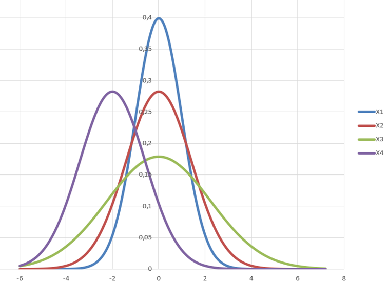 #8. Na obrázku sú Gaussove krivky náhodných premenných X1, X2, X3, X4. Z ich porovnania vyplýva, že najmenší modus má premenná